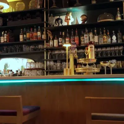 The interior pays homage to Georges Méliès, the pioneering French filmmaker and magician. Dreamlike murals by artist Tofdru cover the walls in surrealist scenes. Warm lighting, vintage furniture sourced from flea markets, and a beautiful marble bar counter create an atmosphere that feels simultaneously cinematic and deeply intimate.